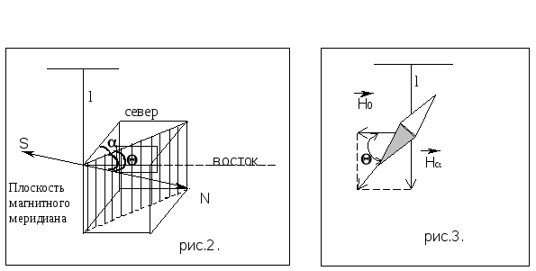 В северном полушарии - южный конец будет наклонён к Земле и стрелка составит с горизонтом угол наклонения (на магнитном экваторе наклонение равно нулю). Вертикальная плоскость, в которой расположится стрелка, называется плоскостью магнитного меридиана. Все плоскости магнитных меридианов пересекаются по прямой NS, а следы магнитных меридианов на земной поверхности сходятся в магнитных полюсах N и S. Так как магнитные полюса не совпадают с географическими полюсами, то стрелка будет отклонена от географического меридиана. Угол, который образует вертикальная плоскость, проходящая через стрелку (т.е. магнитный меридиан), с географическим меридианом, называется магнитным склонением (рис. 2). Вектор