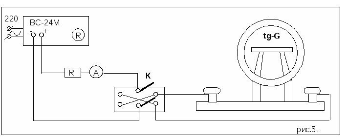 Регулятор напряжения R на панели выпрямителя вывести в крайнее левое положение. Включить выпрямитель и поставить переключатель К в левое или правое положение. Регулятором напряжения R установить ток в цепи, указанный преподавателем (например: I=0,5A). Зафиксировать угол отклонения магнитной стрелки. Перекинуть ключ К в противоположное положение и также зафиксировать угол отклонения стрелки. Это необходимо для плоскости нахождения среднеарифметического значения угла отклонения магнитной стрелки, т.к. всегда имеется неточность в установлении витков tg в плоскости магнитного меридиана.