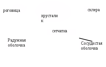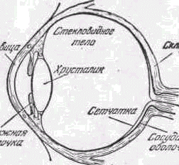 Сосудистая оболочка с внутренней стороны глаза покрыта разветвлениями светочувствительного нерва, особенно густыми напротив зрачка. Эти разветвления образуют сетчатую оболочку, на которой получается действительное изображение предметов, создаваемое оптической системой глаза. Пространство между сетчаткой и хрусталиком заполнено прозрачным стекловидным телом, имеющим студенистое строение. Изображение предметов на сетчатке глаза получается перевернутое. Однако деятельность мозга, получающего сигналы от светочувствительного нерва, позволяет нам видеть все предметы в натуральных положениях.