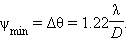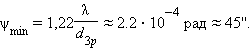 Числовая оценка дает для объектива диаметром D = 10 см, >min >= 6,7*10-6 рад = 1,3”, а для D=102 см, >min >= 0,13”.
