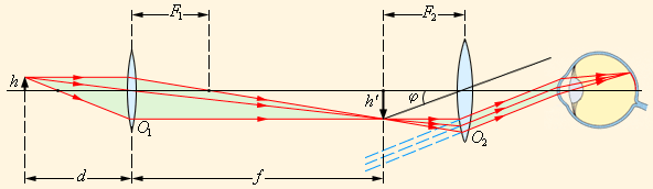Следует отметить, что в некоторых учебниках полагается, что глаз наблюдателя аккомодирован на расстояние наилучшего зрения нормального глаза d>0>. В этом случае ход лучей в приборах несколько усложняется, но угловое увеличение прибора приближенно остается таким же, как и при аккомодации на бесконечность.