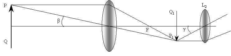 Объектив L>1> дает действительное обратное и сильно уменьшенное изображение предмета P1Q1 , лежащее около главного фокуса объектива. Окуляр помещают так, чтобы изображение предмета находилось в его главном фокусе. В этом положении окуляр играет роль лупы, при помощи которой рассматривается действительное изображение предмета. Действие трубы, так же как и лупы, сводится к увеличению угла зрения. При помощи трубы обычно рассматривают предметы, находящиеся на расстояниях, во много раз превышающих её длину.