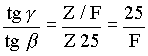 Угловое увеличение. Глаз находится очень близко к линзе , поэтому за угол зрения можно принять угол 2 , образованный лучами, идущими от краев предмета через оптический центр линзы. Если бы лупы не было , нам пришлось бы поставить предмет на расстоянии наилучшего зрения (25 см) от глаза и угол зрения был бы равен 2Y. Рассматривая прямоугольные треугольники с катетами 25 см и F см и обозначая половину предмета Z, можем написать :