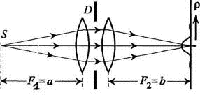 Как в телескопе, так и в микроскопе изображение, полученное с помощью объектива, рассматривается глазом через окуляр. Для того, чтобы реализовать полностью разрешающую способность объектива система окуляр–глаз не должна вносить дополнительных дифракционных искажений. Это достигается целесообразным выбором увеличения оптического инструмента (телескопа или микроскопа). При заданном объективе задача сводится к подбору окуляра. На основании общих соображений волновой теории можно сформулировать следующее условие, при котором будет полностью реализована разрешающая способность объектива: диаметр пучка лучей, выходящих из окуляра не должен превышать диаметра зрачка глаза d>3p> . Таким образом, окуляр оптического инструмента должен быть достаточно короткофокусным.