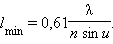 Угол 2u называют аппретурным углом, а произведение n*sinu – числовой апертурой. У хороших объективов угол u близок к теоретическому пределу u=/2. Полагая для примера показатель преломления иммерсионной жидкости n = 1,5, получим оценку: l>min>=0,4.