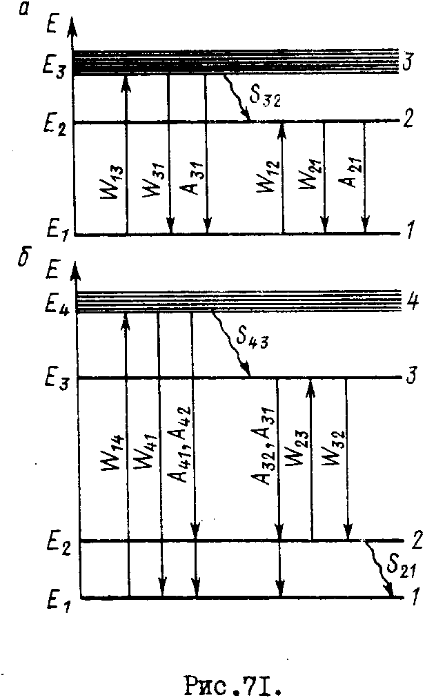 Как показывают исследования, большинство существующих в настоящее время активных сред, используемых- в твердотельных ОКГ, удовлетворительно описываются двумя основными идеализированными энергетическими схемами: трех- и четырехуровневой (рис.71).