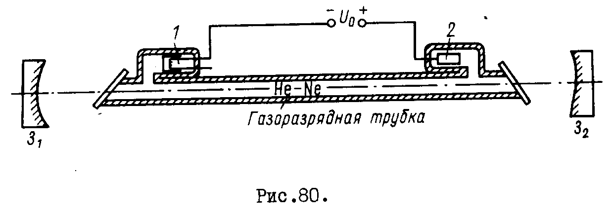 Разряд осуществляют как на постоянном токе (см.рис.91, а), так и переменным напряжением промышленной частоты ( и на рис. 91.ff ). В длинных трубках для упрощения зажигания и поддержания разряда создают секции длиной 80+100 см, разряд в каждой из которых поддерживается независимо от других секций. Обычно используют источники с напряжением примерно 20 кВ и током, достигающим десятков и сотен миллиампер.