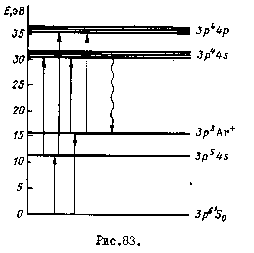 Рассмотрим механизм возбуждения аргоновых ионных ОКГ. На рис. 83 приведена упрощенная диаграмма нижних состояний ионов аргона.В основном.состоянии атом