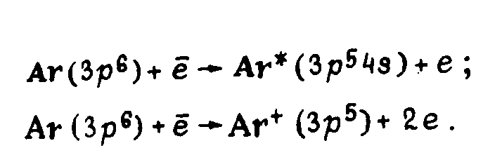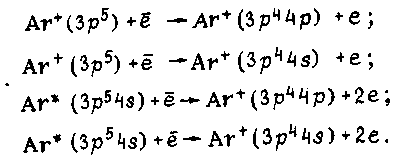 Далее повторные соударения с электронами приводят к образованию возбужденных ионов с электронными конфигурациями Зр^р и
