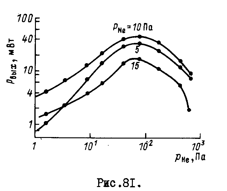 Большой практический интерес представляет зависимость мощности генерации от диаметра разрядной трубки (рис.87). Из рисунка видно, что удельная мощность генерации растет с увеличением диаметра разрядной трубки. Поэтому для получения большой мощности выгоднее использовать разрядные трубки увеличенного диаметра (до 10+15 мм). Однако при этом встречаются трудности в получении равномерного разряда по всей площади трубки, требуются мощные катоды, обеспечивающие большие токи эмиссии (до сотен ампер).