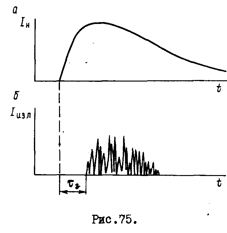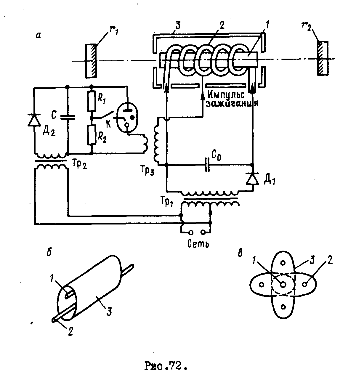 Питание ламп осуществляется от батареи конденсаторов С>о> (см.рис.72,а ), заряжаемых часто от сети переменного напряжения через повышающий трансформатор Тр. и выпрямительный элемент Д. . Нормальное напряжение заряда конденсаторов должно быть меньше напряжения самопробоя импульсной лампы накачки. Зажигание разряда в лампе осуществляется подачей на поджигапщий электрод высоковольтного инициирующего импульса от управляющей схемы. На рис.72,а последняя состоит из конденсатора С , заряжаемого от сети через диод Д2, тиратрона с холодным катодом и импульсного трансформатора Тр1. При замыкании кнопки К тиратрон зажигается, конденсатор с разряжается через первичную обмотку трансформатора и на вторичной обмотке появляется высоковольтный импульс.
