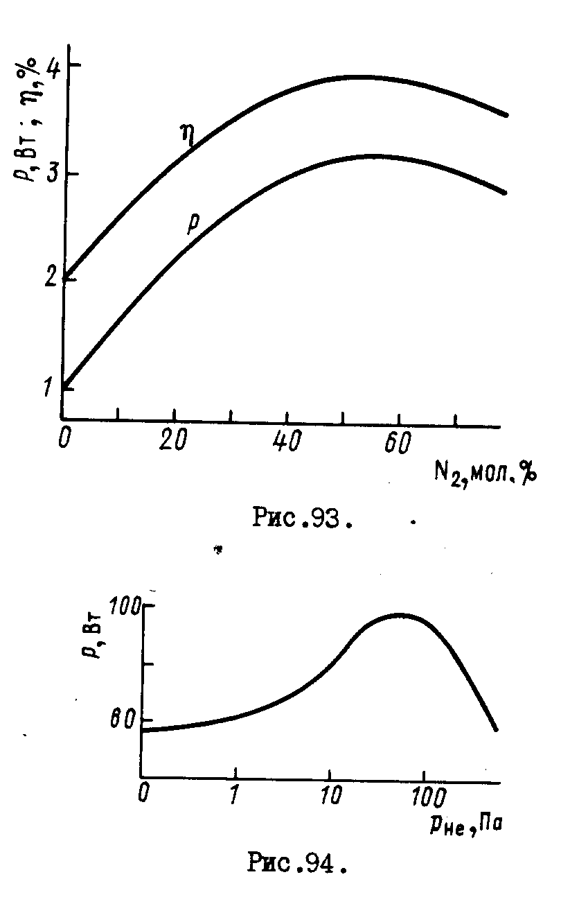 Существенное влияние на энергетические характеристики ОКГ на COp-Nn оказывает введение в разрядную камеру гелия (рис.94)1 Гелий, обладая теплопроводностью, в несколько раз превышавшей теплопроводность СОв^ и Nn, снижает газовую температуру, что способствует увеличению инверсной населенности, а значит,и выходной мощности. Кроме того, с введением в разряд гелия воз