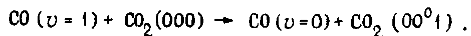 Существенную роль в заселении верхнего рабочего уровня играет резонансная передача колебательной энергии от молекул СО молекулам СОр . В газовом разряде благодаря диссоциации молекул СОо образуется значительное количество молекул СО , которые при соударениях с электронами интенсивно переводятся в колебательно-возбужденное состояние. Первый возбужденный колебательный уровень молекулы СО почти совпадает с верхним рабочим уровнем (00 Г) молекул СОр. Благодаря этому происходит процесс резонансной передачи колебательной энергии от молекул СО (так же, как от молекул Nn ) молекулам СОр: