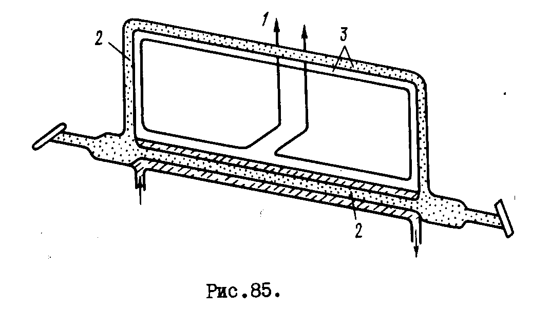 При мощном дуговом разряде происходит процесс перекачки газа от анодного конца трубки к катодному, в результате чего образуется перепад давления и разряд гаснет. Для выравнивания давления по длине капилляра катодную и анодную колбы соединяют обводным каналом 6 , обеспечивающим свободную циркуляцию газа.