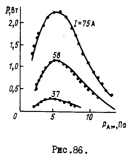 На рис.86 приведена зависимость выходной мощности ОКГ с разрядной трубкой диаметром 10 мм от давления аргона при разных величинах разрядного тока. Из рисунка видно, что существует оптимальное давление, соответствующее максимальной мощности. При малых давле-ниях концентрация ионов незначительна и мощность излучения оказывается небольшой. При больших давлениях концентрация ионов велика, но мала длина свободного пробега электронов и, следовательно, мала их энергия. Это ведет к снижению эффективности возбуждения ионов при соударениях с электронами, вследствие чего инверсия, а значит, и мощность излучения получаютсянезначительными. Величина оптимального давления зависит от диаметра разрядной трубки. Она растет с уменьшением диаметра. Экспериментально установлено, что величина оптимального давления рот в зависимости от диаметра трубки d определяется при jd = 100 А/см ( j - плотность тока разряда) соотношением Ропт = 6,5ct ~^, здесь d выражено в сантиметрах. Для реально используемых трубок d = 0,1+1,5 см, ру^ = 100+4 Па.
