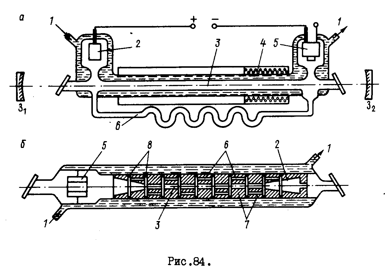 На рис.84, о. приведена схема аргонового ОКГ. Он отличается от гелий-неонового ОКГ лишь конструкцией газоразряцной трубки. Как уже отмечалось, в ионных ОКГ используется сильноточный дуговой разряд, обеспечивающий высокую степень ионизации газа. Для генерации необходима плотность тока разряда до нескольких сотен ампер на I см~. Разряд происходит в узкой капиллярной трубке 3 , охлаждаемой водой 1 . Рабочее давление аргона в разрядном капилляре устанавливается в несколько десятков паокалей. Электроды трубки должны быть рассчитаны на разрядные токи до сотен ампер и иметь высокую стойкость к электронной и ионной бомбардировке. Анод Ч обычно охлаждают водой. Часто применяют в таких ОКГ оксвдные катоды 5 . Хорошо зарекомендовали себя также импрегнированные катоды, представляющие собой пористую