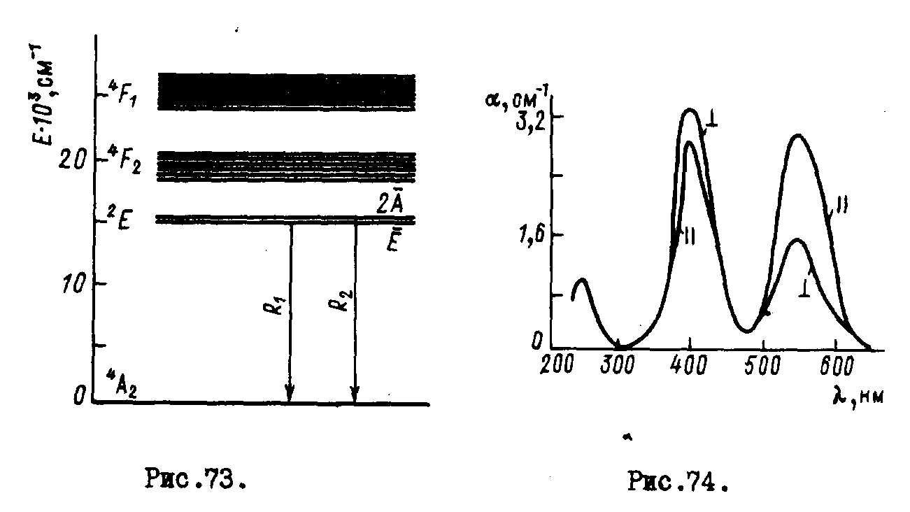 полями кристаллической решетки. Обозначения уровней, приведенные на рис.73, заимствованы из теории групп, которая используется при расчете, и не связаны непосредственно с принятыми обозначениями уровней свободных ионов. Рабочим является переход 2Е->4А2. Состояние 2Е является метастабильным. При комнатной температуре его время жизни составляет около 3 мс. Уровень 2E в действительности состоит из двух подуровней Е и 2А , разделенных промежутком 29 см-1. Переходы с этих подуровней в основное состояние 4А2 соответствуют линиям излучения света R1 и R2 с длиной волны 694,3 и 692,9 нм при температуре 300°С.