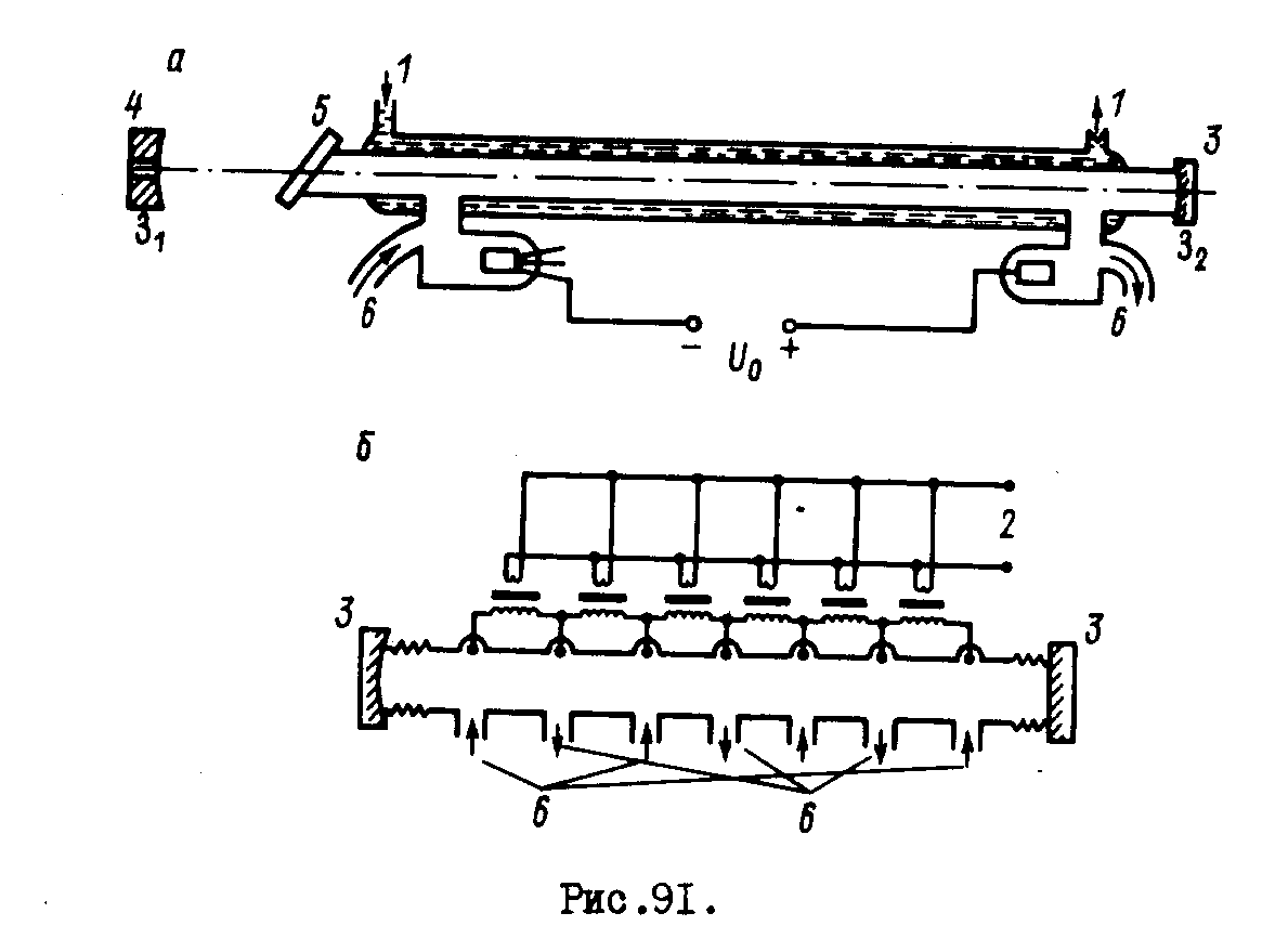 На рис.91 приведены схемы конструкций ОКГ на углекислом газе. В мощных СКГ длина разрядных трубок достигает нескольких метров, а диаметр - 70 -5-80 мм. Дальнейшему увеличению диаметра препятствует контрагирование столба газового разряда, которое наступает для смеси No-СОо при диаметрах, больших,чеп 40 мм, а на смесях Nn-CO-He при диаметрах, больших» чем 70* т80 мм. В ОКГ на СО^ используется принудительное водяное охла ждение трубок ( 1 на рис.91,а). 1%