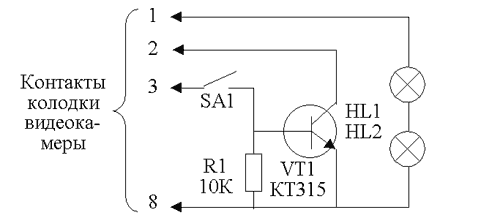 Рис. 3. Схема осветителя, подключаемого к колодке дополнительного оборудования видеокамер фирмы SONY