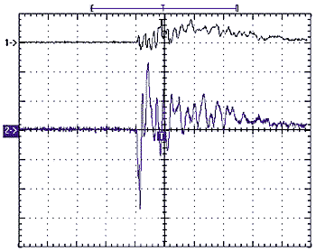 Что же касается устройств защиты линий связи и цифровых интерфейсов, то здесь многокаскадная структура часто реализуется в самом устройстве. Первый каскад производит отвод основной части энергии импульса. При этом высокочастотная составляющая, соответствующая обычно фронту импульса, проникает через первый каскад из-за ограниченного быстродействия последнего. Эта часть шунтируется быстродействующими стабилитронами второго каскада (время срабатывания - порядка 1-10 нс для разных модификаций ). Результаты лабораторного тестирования показали высокую эффективность подобных устройств. Так, например, грозовой импульс амплитудой 4 кВ от стандартного испытательного генератора может быть погашен практически полностью (см. рис. 9).