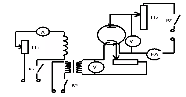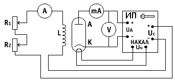 В цепи диода источник питания ИП служит для подачи анодного напряжения U>А> на лампу и напряжения U>N> на нить накала лампы. Анодное напряжение U>А> измеряется с помощью вольтметра V . Сила тока I>А> в анодной части цепи измеряется с помощью миллиамперметра mA. Анодное напряжение регулируется с помощью ползунка, вмонтированного в источник питания.