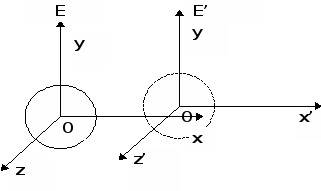 Пусть в системе отсчета > > в начальный момент > > в точке, совпадающей с началом координат произошла вспышка света. В последующий момент времени > >фронт световой волны, в силу закона постоянства скорости света, распространился до сферы радиуса > > с центром в начале координат системы > >. Однако в соответствии с постулатами Эйнштейна, это же явление мы можем рассмотреть и точки зрения системы отсчета > > , движущейся равномерно и прямолинейно вдоль оси > >, так, что ее начало координат и направления всех осей совпадали в момент времени > > с началом координат и направлениями осей первоначальной системы > >. В этой движущейся системе, соответственно постулатам Эйнштейна, за время > > свет также распространится до сферы радиуса
