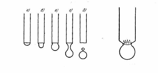 Этим объясняется шарообразная форма небольших капель жидкости. Хорошо известна, например, шаровидная форма капель ртути, у которой коэффициент поверхностного натяжения, как и у многих других расплавленных металлов, довольно велик - около 500 дин/см. Этим же объясняется почти строго шаровидная форма капель жидкости, вытекающих из узкой трубки.