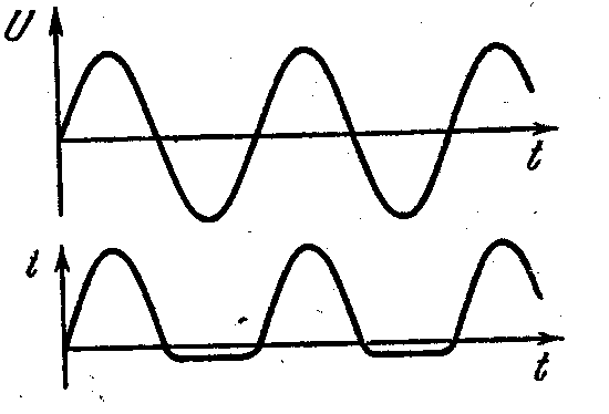 использован для выпрямления переменного тока. На рис. 12 показан график тока, текущего через переход, в том случае, если приложенное напряжение изменяется по гармоническому закону. В этом случае ширина слоя, обедненного носителями, и сопротивление перехода пульсируют, изменяясь в такт с изменениями напряжения.