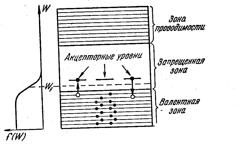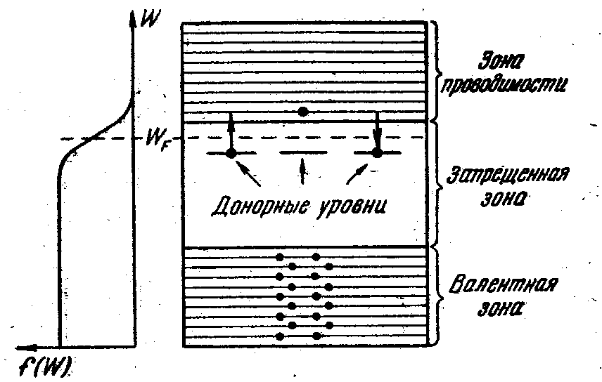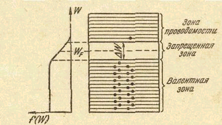 Распределение электронов по уровням валентной зоны и зоны проводимости определяется функцией Ферми. Вычисления показывают, что уровень Ферми лежит точно посредине запрещенной зоны(рис.1). Следовательно, для электронов, перешедших в зону проводимости, величина W—W>F> мало отличается от половины ширины запрещенной зоны. Уровни зоны проводимости лежат на хвосте кривой распределения. Поэтому вероятность их заполнения электронами можно находить по формуле