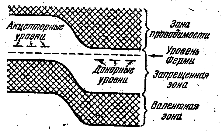 На схеме уровней (рис. 7) акцептору соответствует расположенный в запретной зоне недалеко от ее дна локальный уровень. Образованию дырки отвечает переход электрона из валентной зоны на акцепторный уровень. Обратный переход соответствует разрыву одной из четырех ковалентных связей атома примеси с его соседями и рекомбинации образовавшегося при этом электрона и дырки.