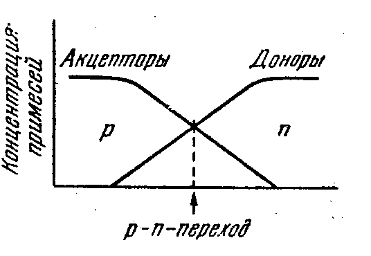 Полупроводниковые устройства можно подразделить на две группы: устройства с точечными контактами и устройства с плоскостными контактами. Мы ограничимся рассмотрением плоскостных диодов и транзисторов. Основным элементом плоскостных устройств является так называемый р—n-переход. Он представляет собой тонкий слой на границе между двумя областями одного и того же кристалла, отличающимися типом примесной проводимости. Для изготовления такого перехода берут, например, монокристалл из очень чистого германия с электронным механизмом проводимости (обусловленным ничтожными остатками примесей). В вырезанную из кристалла тонкую пластинку вплавляют с одной стороны кусочек индия. Во время этой операции, которая осуществляется в вакууме или в атмосфере инертного газа, атомы индия диффундируют в германий на некоторую глубину. В той области, в которую про
