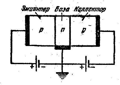 р—n—р (рис. 13). Для его изготовления берут пластинку из очень чистого германия с электронной проводимостью и с обеих сторон вплавляют в нее индий. Концентрация носителей в эмиттере и коллекторе, т. е. в дырочной области, должна быть