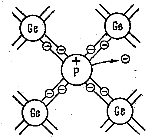 от атома за счет энергии теплового движения, образуя странствующий свободный электрон. В отличие от рассмотренного раньше случая образование свободного электрона не сопровождается нарушением ковалентных связей, т. е. образованием дырки. Хотя в окрестности атома примеси возникает избыточный положительный заряд, но он связан с этим атомом и перемещаться по решетке не может. Благодаря этому заряду атом примеси может захватить приблизившийся к нему электрон, но связь захваченного электрона с атомом будет непрочной и легко нарушается вновь за счет тепловых колебаний решетки.