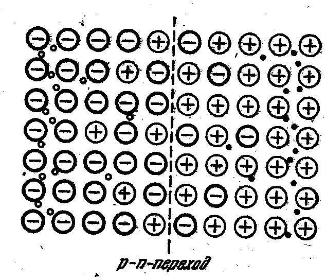 На рис. 8 показан ход концентрации примесей в направлении, перпендикулярном к граничному слою. В р-области основными носителями тока являются дырки, образовавшиеся в результате захвата электронов атомами примеси (акцепторы при этом становятся отрицательными ионами); кроме того, в этой области имеется небольшое число неосновных носителей — электронов, возникающих вследствие перевода тепловым движением электронов из валентной зоны непосредственно в зону проводимости (этот процесс немного увеличивает и число дырок). В n-области основные носители тока—электроны, отданные донорами в зону проводимости (доноры при этом превращаются в положительные ионы); происходящий за счет теплового движения переход электронов из валентной зоны в зону проводимости приводит к образованию небольшого числа, дырок — неосновных носителей для этой области. Диффундируя во встречных направлениях через пограничный слой, дырки и электроны рекомбинируют друг другом. Поэтому р—n-переход оказывается сильно обедненным носителями тока и приобретает большое сопротивление. Одновременно на границе между областями возникает двойной электрический слой, образованный отрицательными ионами акцепторной примеси, заряд которых теперь не компенсируется дырками, и положительными ионами- донорной примеси, заряд которых теперь не компенсируется электронами {рис; 9; кружки—ионы, черные течки — электроны, белые точки—дырки) . Электрическое поле