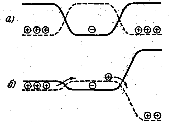 больше, чем концентрация носителей в пределах базы, т. е. в электронной области. На рис. 14, а даны кривые потенциальной энергии — электронов (сплошная линия) и дырок (пунктирная линия).
