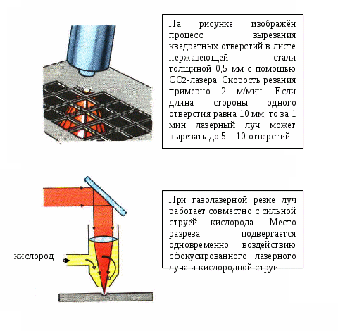 Для резки металлов нужны лазеры мощностью в несколько киловатт. Требуемую мощность можно снизить, применяя метод газолазерной резки - когда одновременно с лазерным лучом на разрезаемую поверхность направляется сильная струя кислорода. При горении металла в кислородной струе (за счет происходящих в этой струе реакций окисления металла) выделяется значительная энергия; в результате может использоваться лазерное излучение мощностью всего 100-500 Вт. Кроме того, струя кислорода сдувает и уносит из зоны разрезания расплав и продукты сгорания металла.