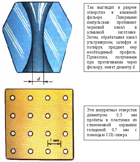 Вскоре после своего появления на свет лазер получил следующее задание, с которым справился столь же успешно, — сверление (пробивание) отверстий в алмазных фильерах. Для получения очень тонкой проволоки из меди, бронзы, вольфрама используется технология протягивания металла сквозь отверстие соответствующего диаметра. Такие отверстия высверливают в материалах, обладающих особо высокой твердостью, — ведь в процессе протягивания проволоки диаметр отверстия должен сохраняться неизменным. Наиболее тверд, как известно, алмаз. Поэтому лучше всего протягивать тонкую проволоку сквозь отверстие в алмазе — сквозь так называемые алмазные фильеры. Лишь с помощью алмазных фильер удается получать сверхтонкую проволоку, имеющую диаметр всего 10 мкм. Но как просверлить тонкое отверстие в таком сверхтвердом материале, как алмаз? Механически это сделать очень трудно — для механического сверления одного отверстия в алмазной фильере требуется до десяти часов. Зато, как оказалось, совсем нетрудно пробить это отверстие серией из нескольких мощных лазерных импульсов.