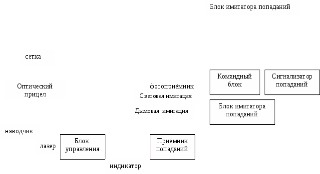 Так как имитаторы стрельбы и тренажеры соответствуют по дальности стрельбы тем видам оружия, которые они имитируют, т. е. в пределах от сотни метров до нескольких километров, то предполагают применить маломощные твердотельные лазеры, газовые и полупроводниковые лазеры, простые по конструкции, надежные в эксплуатации, безопасные для «противника». И как отмечают, влияние тумана и дымки на прохождение лазерного излучения в атмосфере дает положительный эффект для тренировок. Условия стрельбы ухудшаются, но если наводчик видит цель в пределах возможностей своего оружия, то и излучение лазера достигнет цели. Быстродействие лазерных имитаторов дает возможность использовать их для имитации стрельбы любых средств поражения, обладающих любой начальной скоростью. Сообщают, что в такие имитаторы приходится вводить специальные устройства, рассчитанные на задержку «выстрела» в целях приведения его в соответствие с полетным временем снаряда или пули, а также при стрельбе по движущимся целям с упреждением. Здесь представлена схема лазерного тренажера.