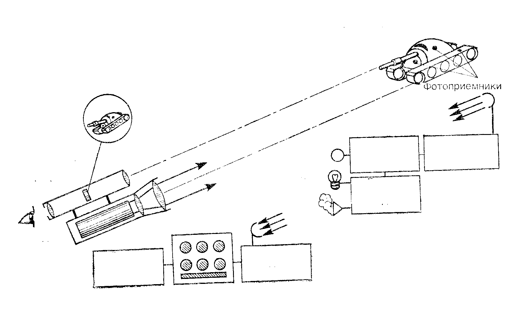 Она включает в себя два варианта аппаратуры. Первым оборудуется наводчик, вторым — объект поражения: танк, самолет, вертолет и т. п. Аппаратура наводчика содержит оптический прицел, через который наводчик наблюдает объект поражения и удерживает перекрестье прицела на цели, лазерный источник излучения и блок управления его работой, пульт регистрации попадании и приемник попаданий. На объекте поражения устанавливается блок имитатора попаданий. Он состоит из набора фотоприемников, размещенных на объекте в различных его точках (на башне, на защитном щитке водителя, на баке с топливом и т. д.), и командного устройства, включающего в работу световой, звуковой или дымовой имитатор, который указывает экипажу о поражении танка, а также наводчику — о попадании в объект поражения. На основе такой схемы за рубежом был разработан ряд тренажеров. Некоторые из них используют штатные средства с небольшими изменениями. Проведенные испытания позволяют сделать вывод, что существенно сокращается стоимость учебных стрельб за счет экономии боеприпасов, за счет многократного использования мишеней и упрощения тренировочного оборудования. Сообщается, что экспертная комиссия дала свою оценку и показала, что качество подготовки стрелков и наводчиков повышается, однако и тренажеры продолжают совершенствовать. Если в первых сериях тренажеров в качестве источника излучения применялся рубиновый лазер, то впоследствии он был заменен лазером полупроводникового типа на арсениде галлия. Затем изменениям подверглась прицельная система. В ней были установлены дополнительные линзы и зеркала, которые имитируют введение упреждения при стрельбе по движущимся целям, установку требуемого угла возвышения. Установка прицела производится по результатам измерения дальности с помощью дальномерной приставки, которая вводит в логическую схему величину коррекции направления луча с тем, чтобы установка прицела соответствовала истинному расстоянию до цели и баллистике данного снаряда. Имитация вспышки производится ксеноновым прожектором, который включается в момент излучения лазерного импульса. Внутри башни танка смонтирован блок управления, с помощью которого подаются команды имитатора стрельбы. Панели управления имеются у командира танка и заряжающего. На панели последнего имеются красная и зеленая кнопки, которые включаются в зависимости от того, какой вид боеприпаса используется. Приемники лазерного излучения расположены по периметру башни тапка. Их пять штук. Каждый из них по углу ноля зрения перекрывает 36° по азимуту и ±15° по углу места. При попадании луча лазера, имитирующего выстрел орудия, на один из приемных фотодетекторов, включается блок радиостанции, который посылает стреляющему танку сигнал о поражении цели. Одновременно в танке-цели включается сигнальное устройство, информирующее экипаж о поражении их танка. Кроме того, баллон, смонтированный на башне танка, начинает дымить в течение 30 с. Иногда вместо одного баллона устанавливают ряд петард, что дает гораздо больший эффект.