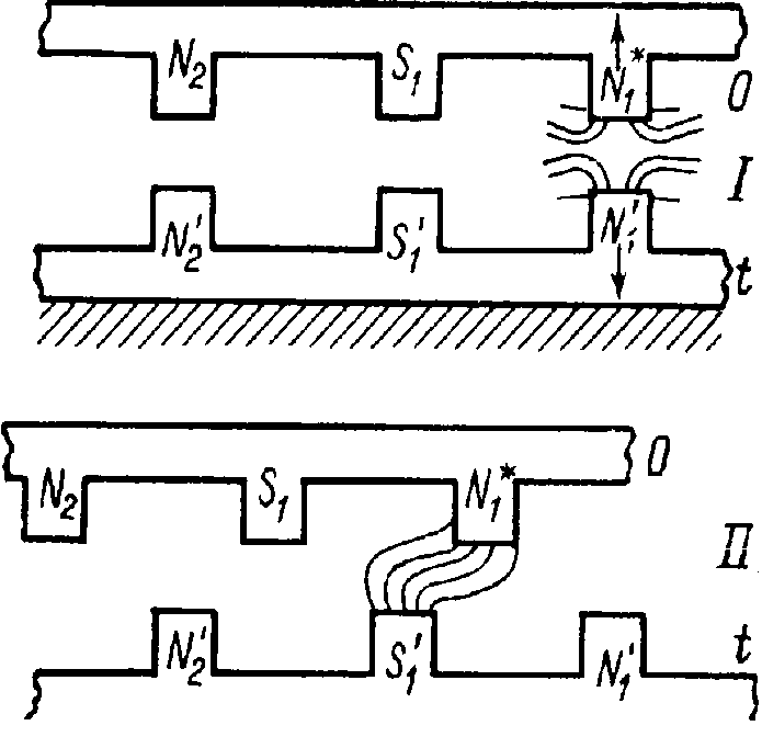 Двигатель Якоби состоял из двух групп П-образных электромагнитов. Восемь из них, установленных на неподвижной раме, были соединены последовательно и питались током непосредственно от батареи гальванических элементов, причем направление тока в этих; электромагнитах оставалось постоянным. Восемь электромагнитов, установленных на подвижном диске, были подключены к батарее через коммутатор, с помощью которого направление тока в каждом из них изменялось 8 раз за один оборот диска. N>1,> S>1,> и N>2> полюсы электромагнитов подвижного диска, N’>1>, S’>1> и N'>2> -полюсы электромагнитов неподвижной рамы (рис 2.) .Обмотка электромагнитов, чтобы не усложнять схем, не показана.