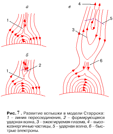 Что касается механизма генерации самих вспышек (и, естественно, связанных с ними потоков), то наиболее популярной в настоящее время является предложенная в 1964 году Петчеком модель вспышки, основанная на гипотезе о магнитном пересоединении [14]. Развитие солнечной вспышки в рамках модели Петчека представлено на рис.7.