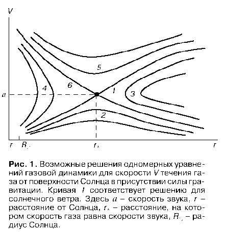 Однако в своей работе [1] Паркер обратил внимание на то, что давление на бесконечности, получаемое из формулы (3) для статической короны, оказывается почти на порядок величины больше значения давления, которое оценивалось для межзвездного газа на основе наблюдений. Чтобы устранить это расхождение, Паркер предложил, что солнечная корона не находится в состоянии статического равновесия, а непрерывно расширяется в окружающую Солнце межпланетную среду. При этом вместо уравнения (1) он предложил использовать гидродинамическое уравнение движения вида