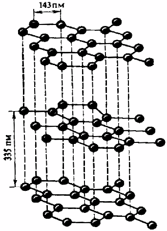 Алмаз. Структура кристаллической решетки показана на рис. 1. Элементарная ячейка кристалла алмаза представляет собой тетраэдр, в центре и четырех вершинах которого расположены атомы углерода. Атомы, расположенные в вершинах тетраэдра, образуют центр нового тетраэдра и, таким образом, также окружены каждый еще четырьмя атомами и т.д. Координационное число углерода в решетке алмаза, следовательно, равно четырем. Все атомы углерода в кристаллической решетке расположены на одинаковом расстоянии (154 пм) друг от друга. Каждый из них связан с другими неполярной ковалентной связью и образует в кристалле, каких бы размеров он ни был, одну гигантскую молекулу.Графит. Структура кристаллической решетки графита показана на рис. 2. Кристаллы графита построены из параллельных друг другу плоскостей, в которых расположены атомы углерода по углам правильных шестиугольников. Расстояние между соседними атомами углерода (сторона каждого шестиугольника) 143 пм, между соседними плоскостями 335 пм. Каждая промежуточная плоскость несколько смещена по отношению к соседним плоскостям, как это видно на рисунке. Каждый атом углерода связан с тремя соседними в плоскостях атомами неполярными ковалентными связями. Каждый атом углерода в атомной решетке графита связан с тремя соседними атомами углерода, тремя sp2—sp2 îáùèìè ýëåêòðîííûìè ïàðàìè, ðàñïîëîæåííûìè â ñîîòâåòñòâèè ñ sp2 - гибридизацией, под углами в 120 град, т. е. каждые четыре связанных между собой атома углерода в графите расположены в центре и вершинах равностороннего треугольника. Четвертые валентные электроны каждого атома располагаются между плоскостями и ведут себя подобно электронам металла, чем и объясняется электрическая проводимость графита в направлении плоскостей. Связь между атомами углерода, расположенными в соседних плоскостях, очень слабая (межмолекулярная, или ван-дер-ваальсова), хотя отчасти, благодаря присутствию электронов проводимости, похожа на металлическую. В связи с такими особенностями кристаллы графита легко расслаиваются на отдельные чешуйки даже при малых нагрузках.