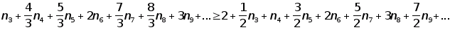 Обозначим через n>3> число треугольных граней выпуклого многогранника, через n>4> - число его четырехугольных граней и т.д. Тогда соотношение один можно переписать так: