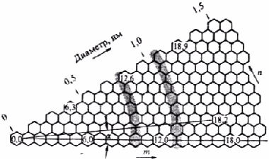 Рассмотрим упрощенную модель нанотрубки. На рисунке 7 представлена идеализированная модель однослойной нанотрубки. Такая трубка не образует швов при сворачивают и заканчивается по-лусферическими вершинами, содер-жащими, наряду с правильными шес-тиугольниками, также по шесть правильных пятиугольников. Нали-чие пятиугольни-ков на концах трубок позволяет рассматривать их как предельный случай молекул фуллеренов, длина продольной оси которых значительно превышает диаметр.Структура однослойных нанотрубок, наблюдаемых экспериментально, во многих отношениях отличается от представленной выше идеализированной картины. Прежде всего это касается вершин нанотрубки, форма которых, как следует из наблюдений, далека от идеальной полусферы.