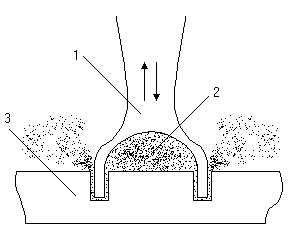 Если между рабочей поверхностью УЗ-вого инструмента и обрабатываемой деталью ввести абразивный материал, то при работе излучателя частицы абразива будут воздействовать на поверхность детали. Материал разрушается и удаляется при обработке под действием большого числа направленных микроударов (рис. 4).
