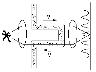 Оптический прибор - знаменитый интерферометр Майкельсона - размещался на тяжёлой каменной плите, которая плавала на ртути в бассейне в подвале здания. Ориентируя этот прибор либо плечом L1 либо плечом L2 вдоль направления движения Земли, не удалось наблюдать какого-либо различия в его показаниях (это различие должно было выразиться в смещении интерференционных полос, наблюдаемых в зрительную трубу), т.е. не удалось измерить скорость V движения Земли в межпланетном пространстве.