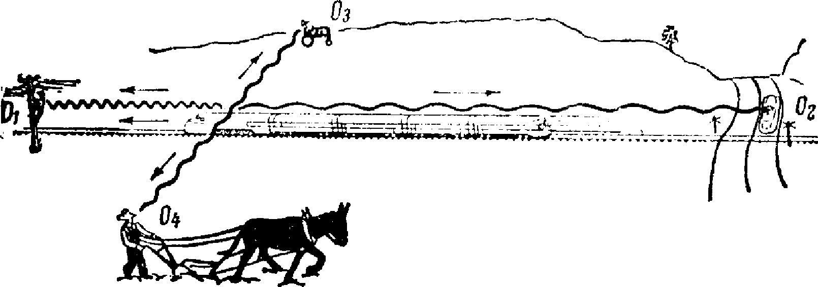 гудка, гонга пожарной машины, свистка или звонка поезда, когда транспорт быстро проносится мимо вас? Даже шум от машины как будто понижает тон, когда машина быстро проезжает мимо вас по дороге. Как объяснить все эти явления? Очевидно, изменение высоты тона вызвано относительным движением источника звука и наблюдателя. На рис. 4 изображен поезд, дающий сигнал при движении по направлению к наблюдателю О1. В результате звуковые волны перед поездом сгущаются, и длина волны сокращается; длины волн, распространяющихся в обе стороны, не изменяются; волны, распространяющиеся назад, удлиняются. С каждой новой посылаемой волной поезд оказывается ближе к наблюдателю 01, чем он был в момент испускания предыдущей волны; следовательно, каждой новой волне приходится проходить меньшее расстояние, чем предыдущей. В результате к наблюдателю 01 приходит большее количество волн в секунду, чем это было бы, если бы поезд оставался неподвижным. Частота увеличивается, и повышается тон свистка. Как изменяются частота и высота звука для наблюдателей O2? О3? 04?