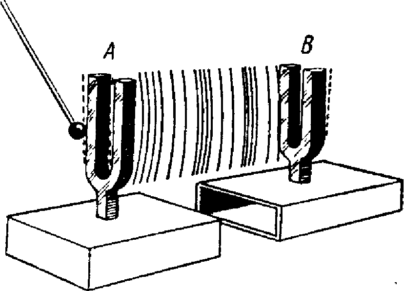 Когда камертон A начинает колебаться, он посылает в воздух чередующиеся сгущения и разрежения. Первое сгущение, достигающее камертона. В, создает небольшое давление на ножки камертона и слегка смещает их. Наступающее следом разрежение позволяет ножкам вернуться в исходное положение. Поскольку В имеет ту же самую собственную частоту, что и -4, каждое последующее сгущение и разрежение от А способствует увеличению амплитуды колебаний В. Таким образом, В вскоре начинает издавать слышимый звук. Такие колебания называются «ответными», или резонансными, колебаниями. Они возникают благодаря явлению резонанса (т. е. «ответа на звук»).