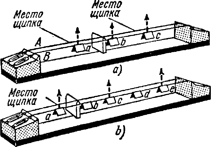 Воспользуемся сонометром с двумя струнами одинаковых размеров, из одинакового материала, одинаковой длины и натянутых до одинаковой частоты (рис. 11, а). Поместим подставку под середину струны Л, так что каждая половина струны будет издавать тон на октаву выше, чем тон струны В. Поместим теперь три бумажных рейтера на струну В в положения а, Ь, с и возбудим струну А щипком в середине одной из половин. Тот факт, что при этом соскочат рейтеры а и с, а рейтер Ь останется неподвижным, показывает, что две половины струны В колеблются таким же образом, как две половины струны Л. Поэтому каждый участок струны В звучит в том же тоне, что и возбужденный щипком участок струны Л.